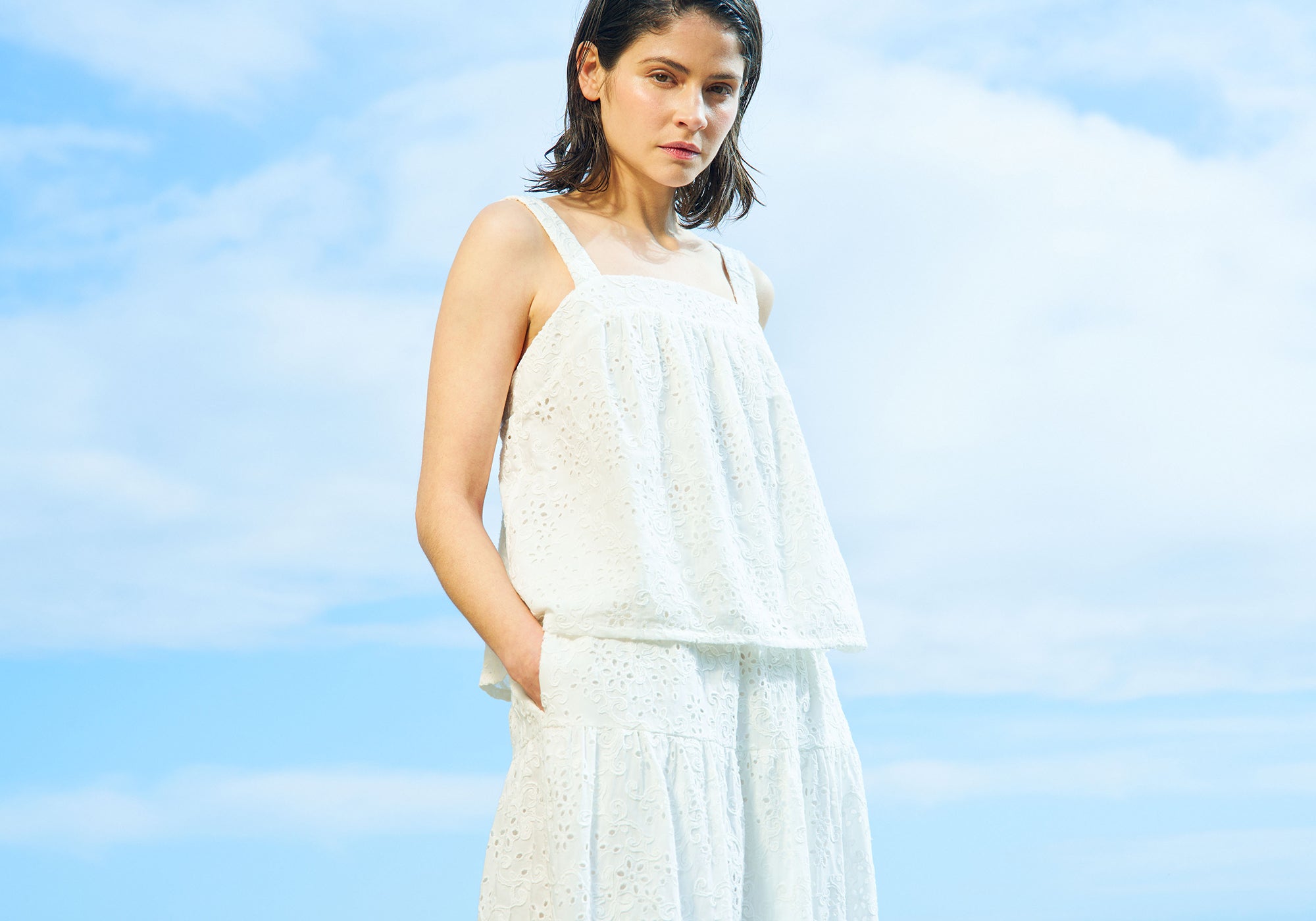 Kaunis Broderie anglais -tyylinen pitsikangas toistuu mallistossamme niin mekoissa, puseroissa, housuissa kuin hameissa. Herkkä pitsi sopiikin kauniisti niin juhliin kuin kesäisiin lomapäiviin.