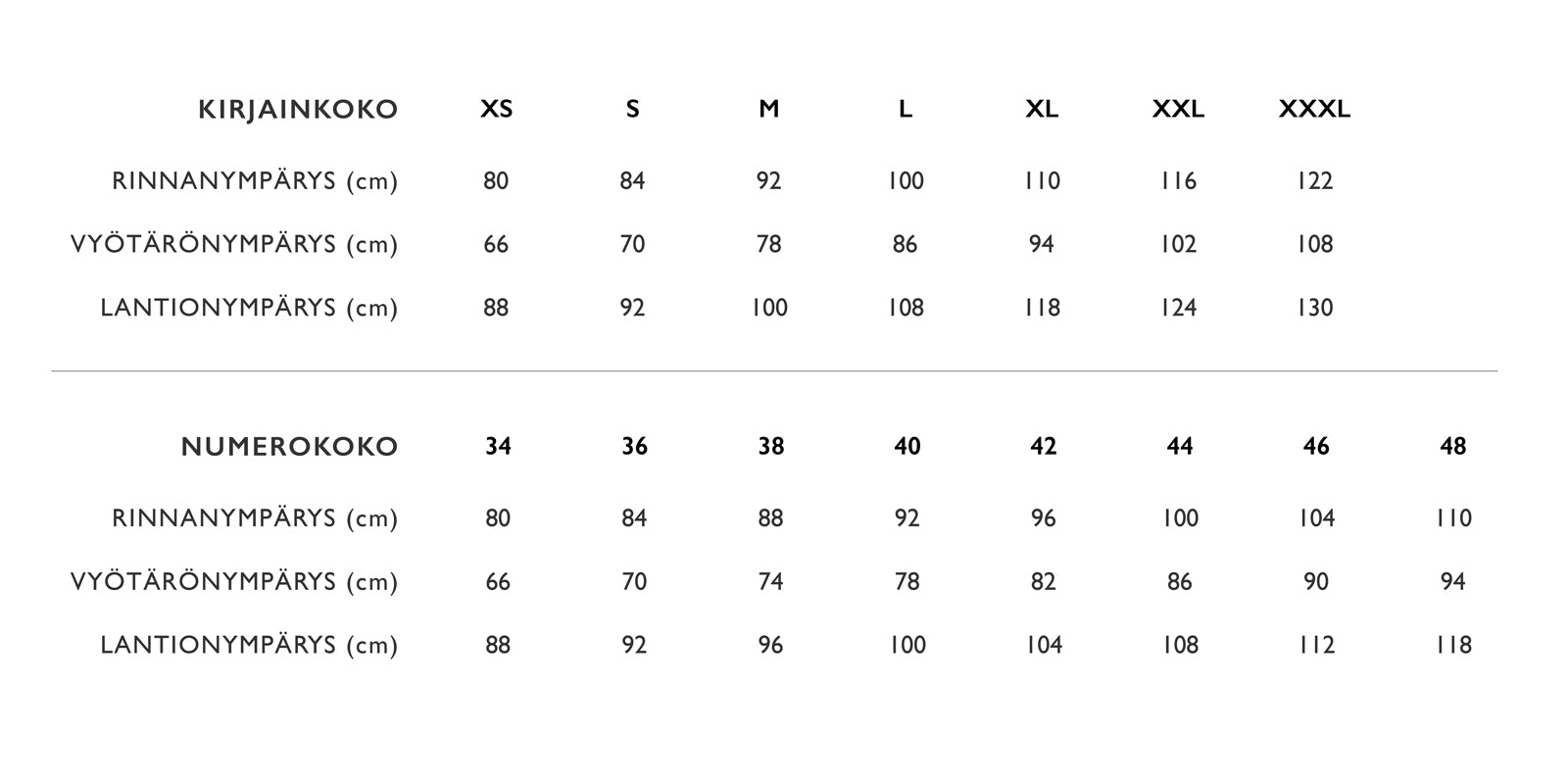 Suosittelemme katsomaan tuotemittoja ja päättämään tuotekohtaisesti oikean koon. Tuotteissa on erilaisia väljyyksiä, joten voit valita haluatko, että tuote on istuva vai väljempi päällä. Huomiothan, että tuotemittoja ei voi suoraan verrata vartalonmittoihin. Tuotteenmittojen tulisi olla isompia, kuin vartalonmittasi, jotta tuotteeseen jää väljyyttä.